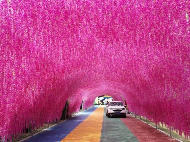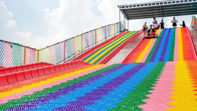 色彩绚丽的滑道,像一道道彩虹挂在山坡