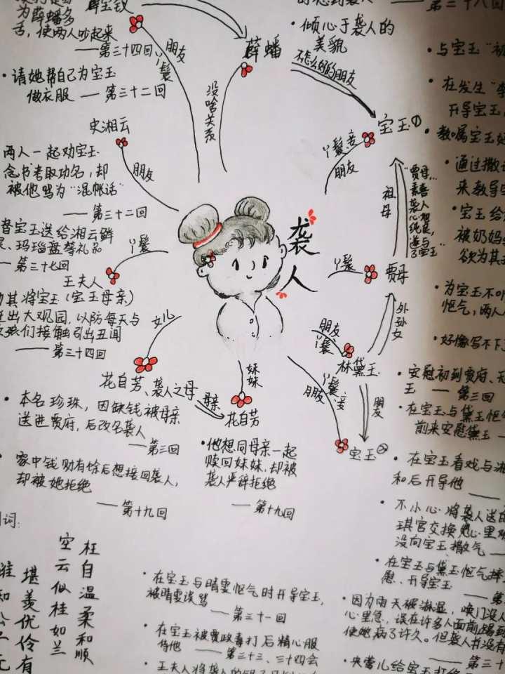 许多同学的作业让语文老师惊喜,比如有同学围绕袭人绘图,以花为隐喻,还把人物性格、判词融合起来,阅读得已经相当深入。